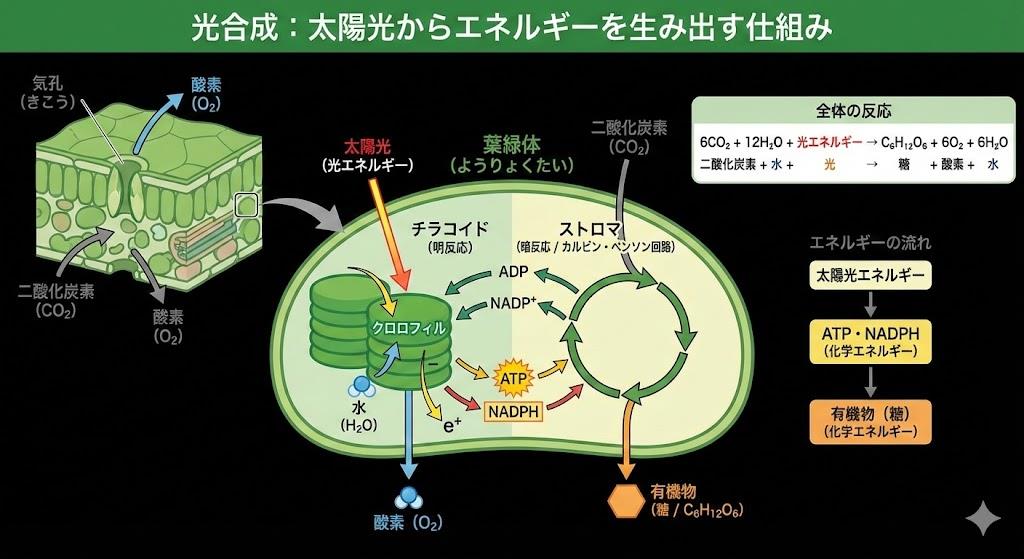 光呼吸の最大のメリットとして現在最も注目されているのが、「過剰なエネルギーを捨てる安全弁」としての機能です。晴天の真昼など、植物には光合成で使い切れないほどの強烈な光エネルギーが降り注ぎます。通常、この光エネルギーは二酸化炭素を糖に変えるために使われますが、何らかの理由(乾燥による気孔閉鎖など)で二酸化炭素が不足すると、エネルギーの行き場がなくなってしまいます 。