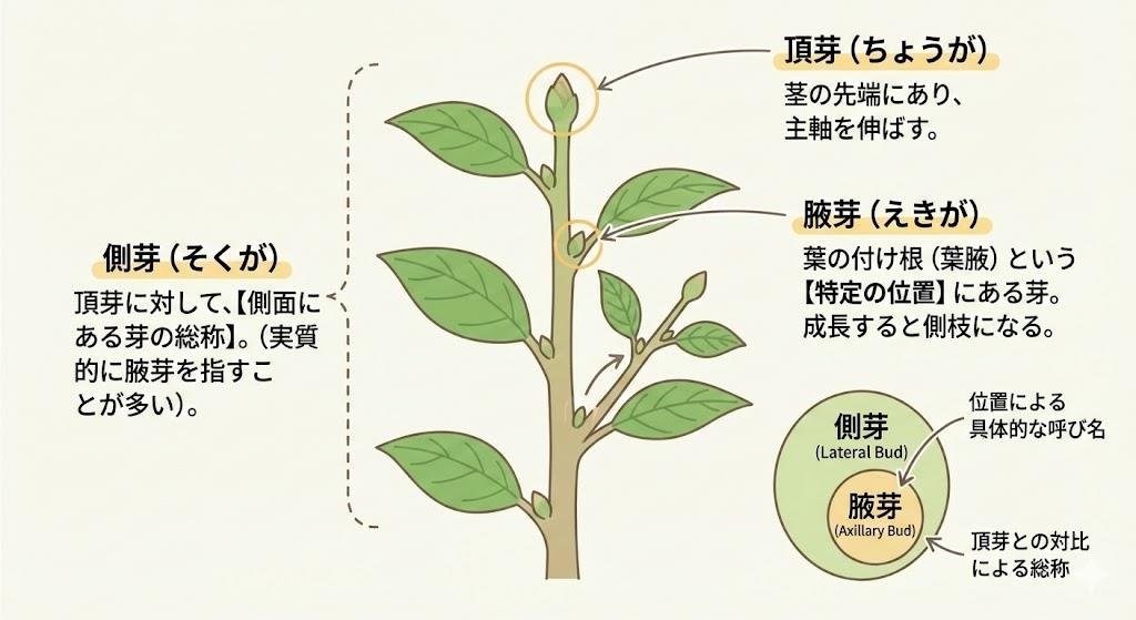 植物には、先端の芽(頂芽)が優先的に成長し、その下にある脇芽(側芽)の成長が抑えられるという性質があります。これを「頂芽優勢」と呼びます。このメカニズムには、オーキシンという植物ホルモンが深く関わっています。